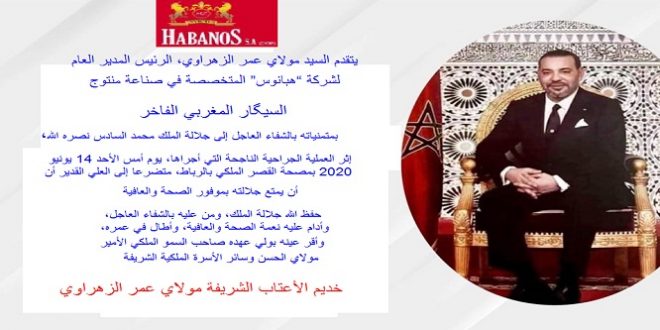 يتقدم السيد مولاي عمر الزهراوي، الرئيس المدير العام لشركة “هبانوس” المتخصصة في صناعة منتوج السيگار المغربي الفاخر، بمتمنياته بالشفاء العاجل إلى جلالة الملك محمد السادس نصره الله، إثر العملية الجراحية الناجحة التي أجراها، يوم أمس الأحد 14 يونيو 2020 بمصحة القصر الملكي بالرباط، متضرعا إلى العلي القدير أن يمتع جلالته بموفور الصحة والعافية.