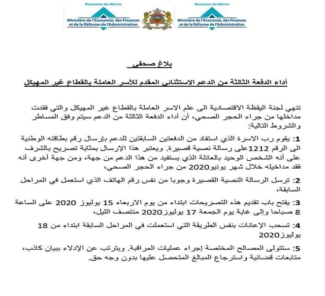 تنهي لجنة اليقظة الاقتصادية الى علم الاسر العاملة بالقطاع غير المهيكل والتي فقدت مداخلها من جراء الحجر الصحي، أن أداء الدفعة الثالثة من الدعم سيتم وفق المساطر والشروط التالية: