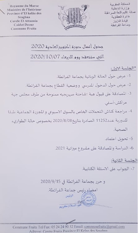 عقد مجلس جماعة الفرايطة بإقليم قلعة السراغنة يومه الأربعاء 7 أكتوبر، جلسة علنية في إطار أشغال دورته العادية لشهر أكتوبر لسنة 2020، والتي تضمن جدول أعمالها 7 نقاط.