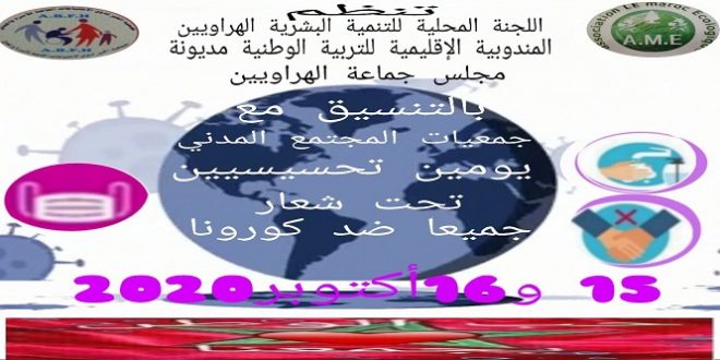 في إطار المجهودات التي ،تبذلها مختلف الأطراف المعنية للقضاء والحد من انتشار جائحة كورونا “كوفيد 19” بالجماعة الترابية الهراويين،ستنظم اللجنة المحلية للتنمية البشرية بشراكة مع المندوبية الإقليمية للتربية الوطنية مديونة والمجلس الجماعي للهراويين وبتنسيق مع جمعيات المجتمع المدني يومين تحسيسيين تحت شعار: “جميعا ضد كورونا” وذلك يومي 15 و 16 أكتوبر 2020 .