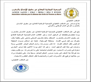 سبق للمكتب التنفيذي للجمعية الوطنية للدفاع عن حقوق الإنسان بالمغرب أن أصدر بيانا رقم1 بخصوص قضية الرفيق أحمد زهير الكاتب العام للجمعية، والذي تم اعتقاله كما ذكرنا سابقا إثر شكايات كيدية تقدم بها بعض مسؤولي المؤسسات العمومية بكل من وكالة المكتب الوطني للماء والكهرباء وكذا رئيس الدائرة الثالثة لمفوضية الأمن باليوسفية ودرك الشماعية وقائدة المقاطعة، تسترا على الفساد المستشري باليوسفية علما أن أحمد زهير بصفته كاتبا عاما للجمعية ورئيس فرع الجمعية باليوسفية ظل فاضحا كل الانتهاكات والخروقات التي تمارسها هذه الجهات السالفة الذكر وغيرها.