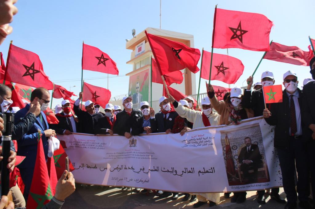 قام وفد يرأسه السيد سعيد أمزازي، وزير التربية الوطنية والتكوين المهني والتعليم العالي والبحث العلمي، الناطق الرسمي باسم الحكومة والسيد ادريس اعويشة، الوزير المنتدب المكلف بالتعليم العالي والبحث العلمي ويضم الكتاب العامين للقطاعات التعليمية الثلاثة: التربية الوطنية، التكوين المهني، التعليم العالي والبحث العلمي ومديرة مكتب التكوين المهني وإنعاش الشغل والمدراء المركزيين ورؤساء الجامعات ومدراء الأكاديميات الجهوية للتربية والتكوين، يومه السبت 19 دجنبر 2020، بزيارة إلى المعبر الحدودي الكركرات بالصحراء المغربية، وذلك للتعبير عن تثمينهم للتدخل الحازم والباسل للقوات المسلحة الملكية تنفيذا لتعليمات صاحب الجلالة الملك محمد السادس نصره الله، القائد الأعلى ورئيس أركان الحرب العامة للقوات المسلحة الملكية، والتي مكنت من تأمين المعبر وعودة حركة التنقل المدني والتجاري بين المغرب وموريتانيا.