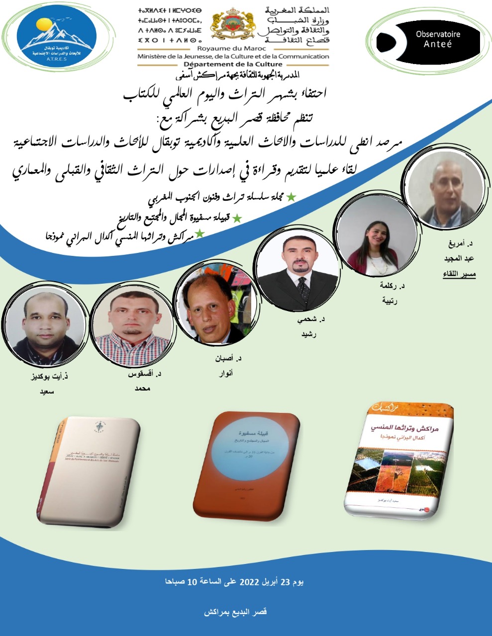 في إطار فعاليات شهر التراث نذكركم بموعدنا ليوم غد السبت 23 أبريل 2022، حيث ستحتضن معلمة قصر البديع ابتداء من الساعة العاشرة صباحا فعاليات لقاء علمي وحفل توقيع ثلاث إصدارات حديثة وهي: