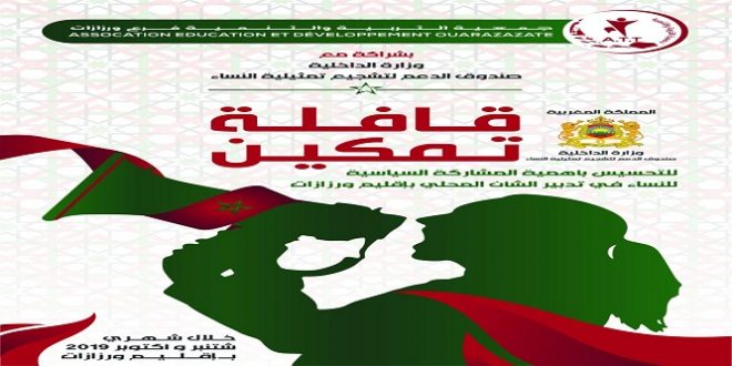 تحت شعار “من اجل مشاركة وازنة للنساء في تدبير الشأن المحلي تنظم جمعية التربية والتنمية فرع ورزازات بشراكة مع صندوق الدعم لتشجيع التمثيلية النسائية “”قافلة “تمكين ” للتحسيس بأهمية المشاركة السياسية للنساء في تدبير الشأن المحلي“خلال شهري شتنبر واكتوبر 2019 بإقليم ورزازات .