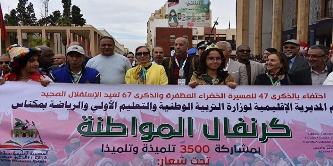 شارك 3500 تلميذ وتلميذة، اليوم الأربعاء بمكناس، في تظاهرة “كرنفال المواطنة”، تخليدا للذكرى الـ 47 للمسيرة الخضراء المظفرة والذكرى الـ 67 لعيد الاستقلال المجيد.