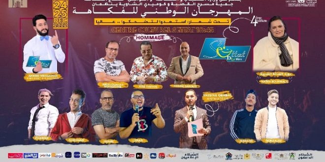 بدعم من وزارة الشباب والثقافة والتواصل – قطاع الثقافة و المجلس الجماعي بسطات تحتضن مدينة سطات في الفترة الممتدة ما بين 24 و 27 دجنبر 2022 ، الدورة الرابعة للمهرجان الوطني للفكاهة تحت شعار ” استعدوا لتضحكوا .. عاليا ”.