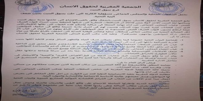 – تحميله كافة المسؤولية للدولة المغربية في شخص السلطات المحلية ومكتب المجلس الجماعي التي تكاسلت في اداء واجبها.
