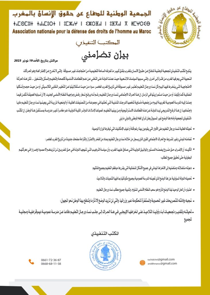 أصدر المكتب التنفيذي للجمعية الوطنية للدفاع عن حقوق الانسان بالمغرب، بيانا حول ما تعرفه الساحة التعليمية من احتجاجات غير مسبوقة هذا نصه كما توصلنا به: