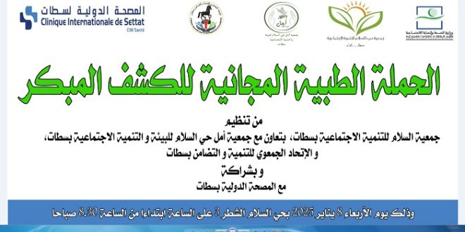 في إطار جهودها لتحسين الولوج إلى الخدمات الصحية للمناطق النائية، تنظم جمعية السلام للتنمية الاجتماعية، قافلة طبية يوم الأربعاء 8 يناير 2025، إبتداءا من الساعة 8:30 صباحا ، والتي ستشمل مجموعة من الفحوصات الطبية المجانية والاستشارات لفائدة سكان حي السلام الشطر 3 بسطات .