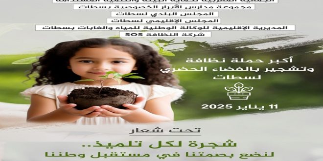 تنظم الجمعية المغربية لحماية البيئة والتنمية المستدامة بمعية مجموعة مدارس الأبرار الخصوصية بسطات، المجلس البلدي لسطات، المجلس الإقليمي لسطات، المديرية الإقليمية للوكالة الوطنية للمياه والغابات بسطات، شركة النظافة بالمدينة، أكبر حملة نظافة وتشجير، تحت شعار “شجرة لكل تلميذ.. لنضع بصمتنا في مستقبل وطننا”، وذلك ابتداء من الساعة العاشرة صباحا من يوم11 يناير 2025.