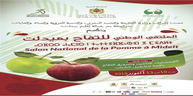 تحت اشراف وزارة الفلاحة والصيد البحري والتنمية القروية والمياهوالغابات بشراكة مع عمالة إقليم ميدلت تحتضن مدينة ميدلتالملتقى الوطني للتفاح تحت شعار”اللوجستيكوالتثمين وتسويق التفاح رافعة لتشغيل الشباب” وذلك من 10 إلى 13 أكتوبر 2019 بشراكة ودعم من شركاء محليين وجهويين ووطنيين.