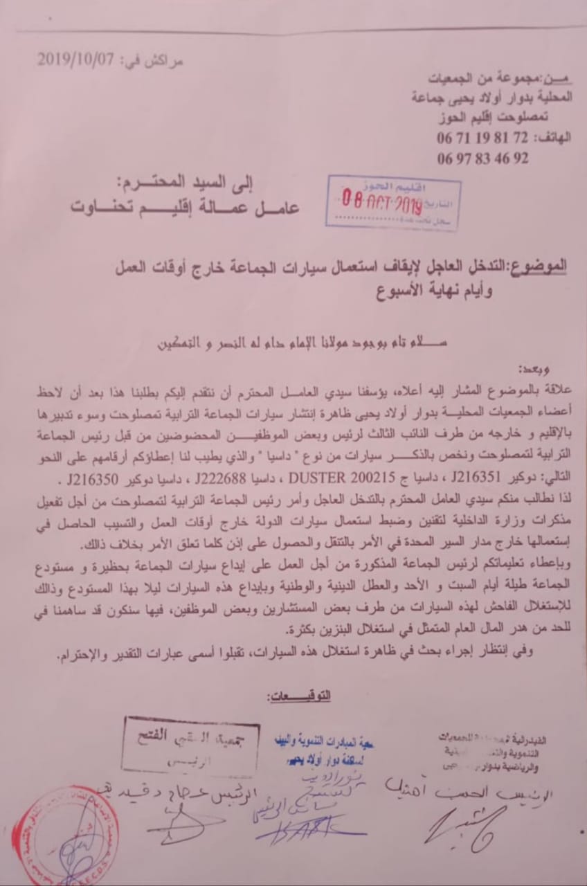 وجه عدد من جمعيات المجتمع المدني بدوار أولاد يحي التابع لتراب جماعة تمصلوحت بإقليم الحوز، شكاية إلى عامل الإقليم حول استغلال سيارات الخدمة خارج أوقات العمل وأيام نهاية الأسبوع.