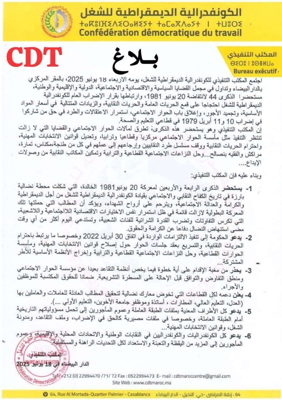 1- يستحضر الذكرى الرابعة والأربعين لمعركة 20 يونيو 1981 الخالدة، التي شكلت محطة نضالية بارزة في تاريخ الكفاح النقابي والاجتماعي بقيادة الكونفدرالية الديمقراطية للشغل من أجل الديمقراطية والكرامة والعدالة الاجتماعية، ويترحم على أرواح الشهداء، ويؤكد أن المطالب التي حملتها تلك المعركة البطولية لازالت قائمة في ظل استمرار نفس الاختيارات الاقتصادية اللا اجتماعية واللاشعبية التي تكرس التفاوتات وتضرب القدرة الشرائية للفئات الشعبية، وتستدعي اليوم أكثر من أي وقت مضى استنهاض النضال دفاعا عن الكرامة والحقوق.