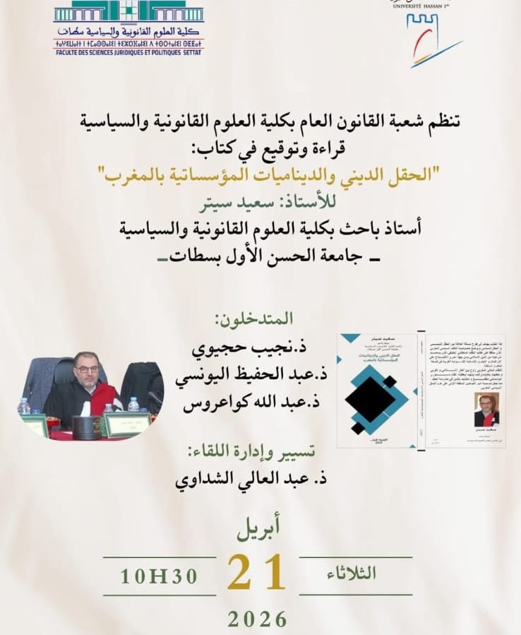 تستعد كلية العلوم القانونية والسياسية بجامعة الحسن الأول في سطات لاستضافة لقاء علمي مميز يوم الثلاثاء 21 أبريل 2026، على الساعة العاشرة والنصف صباحاً، وذلك في إطار الأنشطة الأكاديمية التي تنظمها شعبة القانون العام.