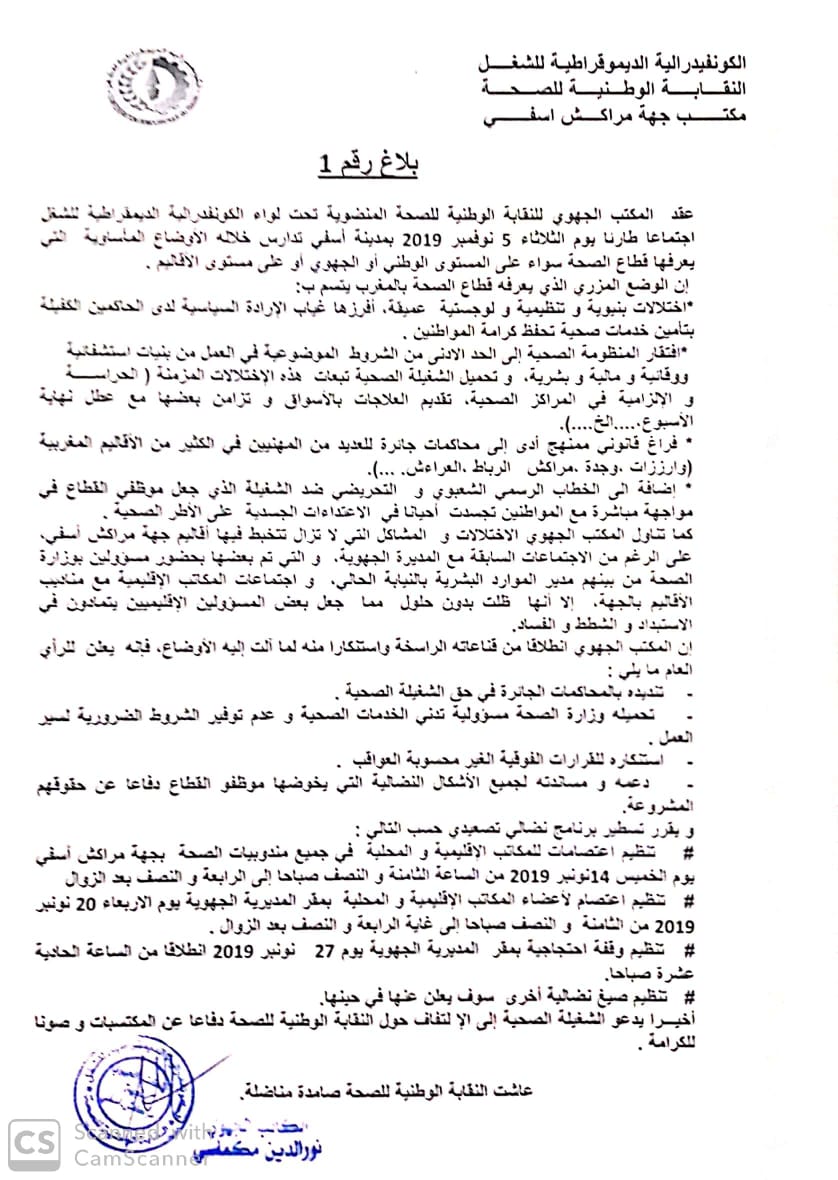 # تنظيم اعتصامات للمكاتب الإقليمية و المحلية في جميع مندوبيات الصحة بجهة مراكش أسفي يوم الخميس 14نونبر 2019 من الساعة الثامنة و النصف صباحا إلى الرابعة و النصف بعد الزوال